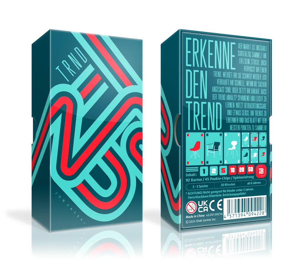 【Produktübersicht】 ◆Titel: TRND ◆Altersempfehlung: ab 8 Jahren ◆Spielzeit: ca. 30 Minuten ◆Anzahl an Spielern: 3 bis 5 ◆Inhalt: : 90 Karten / 1 Übersichtskarte / 45 Punkte-Chips / 1 Startmarker / Spielanleitung ◆Autor: Jun Sasaki ◆Grafik: Jun Sasaki ◆Produktseite: https://oinkgames.com/de/games/analog/trnd/ ◆Presse-Kit: https://www.dropbox.com/scl/fo/6aolsth9x2mm55p42okrk/AD3IYug-zMPhiyQXOD4X3Mg?rlkey=0xs8uotp8e6yov9fouvzpoa7w&dl=0