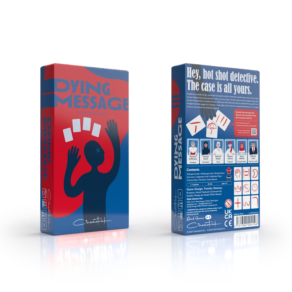 Product Summary ◆Title: Dying Message ◆Ages: 12+ ◆Play time: About 20 minutes ◆Number of players: 2-8 ◆Content: 30 Suspect Cards / 50 Message Cards / Wooden Dice / Dice Cover / 6 Alphabet Chips (A-F) / Judgement Card / 32 Score Chips / Felt Sheet / Game Manual ◆Design: Fumiko Shimizu ◆Artwork: Jun Sasaki, Rie Takahashi ◆Product Page: https://oinkgames.com/en/games/analog/dying-message/ ◆Press Kit: https://www.dropbox.com/scl/fo/i8b31u84o7erda0eu3qf2/AKgrQe7DaAwH7xpl_8G-cdA?rlkey=d52rcrw8vop53d1xhdzy7gihj&dl=0