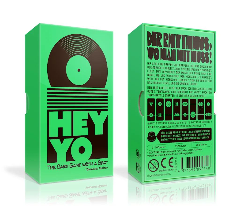 Produktzusammenfassung Titel: HEY YO Price: 20 € Alter: ab 8 Jahren Dauer: ca. 15 Minuten Spieleranzahl: 2-10 Inahlt: 38 Karten x 2 Sets / 1 Rhythmus-Maschine / 8 Chips / Punkteblock / Kugelschreiber / Spielanleitung Spieldesign: Takashi Saito Grafikd: Jun Sasaki Produktseite: https://oinkgames.com/de/games/analog/hey-yo Presse-Kit: https://www.dropbox.com/sh/7mohav7limjz7pg/AABeWgg2g6nZsNJYPVr5oGJsa?dl=0