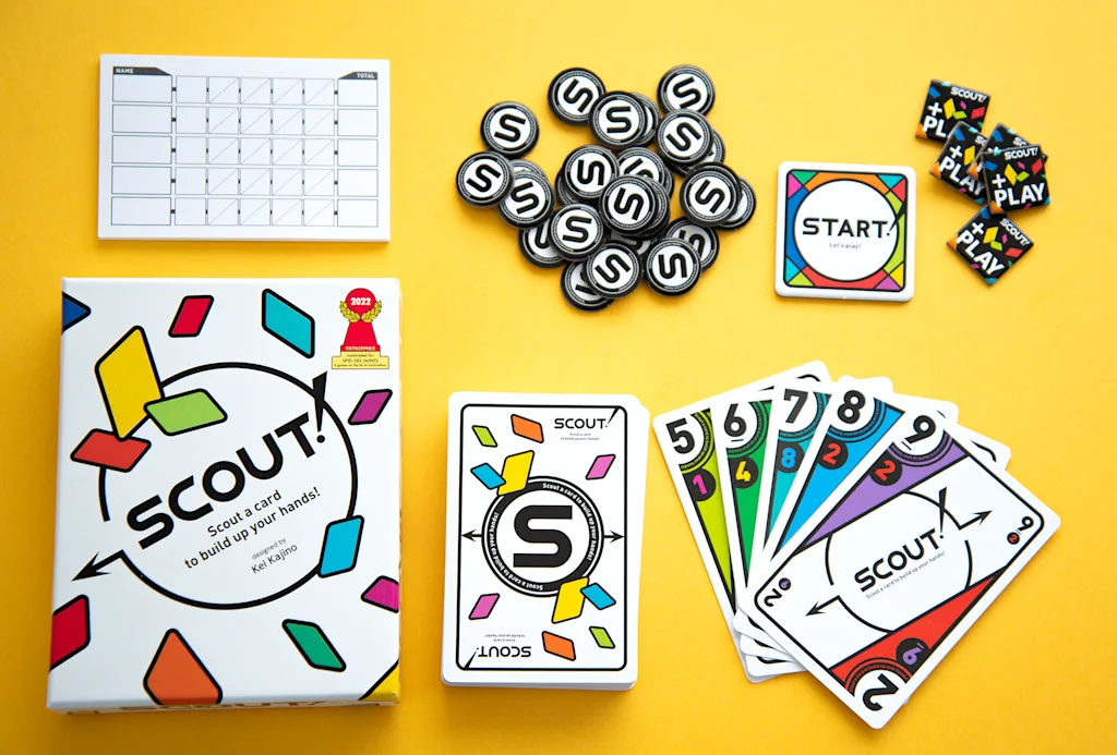 ▪️ドイツ年間ゲーム大賞(Spiel des Jahres)とは 1979年から40年以上の歴史をもつ、ボードゲームで最も権威ある賞の一つです。『SCOUT』は2022年にノミネート。日本人ゲームデザイナーによる作品のノミネートは『街コロ』以来、7年ぶり2回目。日本発のメーカーによる作品のノミネートは賞の歴史の中で初めてで、ヨーロッパ・北米以外のメーカーとしても初となりました。