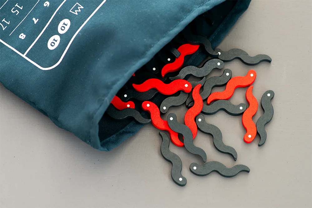 Oink Games Inc. will release the new board game Wriggle Roulette at Game Market Spring 2025, held on May 17 (Sat) and 18 (Sun) at Makuhari Messe. The game will go on sale to the general public starting May 23 (Fri), 2025. Wriggle Roulette is a tabletop game blending luck and strategy. Players take turns reaching into a bag filled with eel and snake-shaped wooden pieces, trying to pull out as many eels as possible. But beware—if the number of snakes grabbed by all players exceeds the limit, a snake outbreak occurs, and the player who grabbed the most pieces loses all of their eels. You want to grab more than everyone else to score big—but a snake outbreak would be devastating... Will you grab a bunch? Just a few? Or back out entirely? Read your opponents' expressions and control your own greed to make the right call. It’s a unique push-your-luck game of risk and strategy. The game is brought to life by its colored wooden pieces shaped like eels and snakes. Inside the bag are 68 small, 35mm-long pieces—black eels and red snakes. Though their colors differ, the wooden pieces share the exact same wiggly shape. Rattling them around in the bag and feeling your way through as you play makes for a truly suspenseful, sweaty-palmed experience! And when everyone opens their hands at once—a burst of excitement.