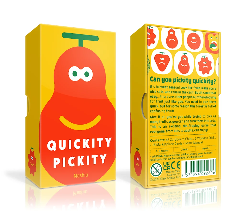 Oink Games is pleased to announce the release of its new board game Quickity Pickity at Spiel ʻ22. Get your brain in gear, and let’s get to matching up some fruits. A frantic tile-flipping game for kids and adults alike!