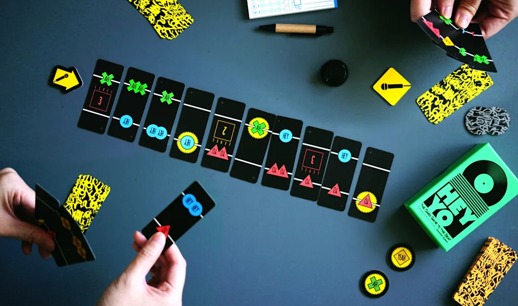 [Nominated for innoSPIEL!] Take turns playing cards to the rhythm and aim for the high score in this cooperative style game. Become a member of a rap crew and skillfully connect the cards to show the crowd what you've got! If you make it to the target score you can step it up and challenge the next stage. The rhythm won't wait for you! A fast reaction time and team work is everything! Up to 5 players can join in on this team battle!
