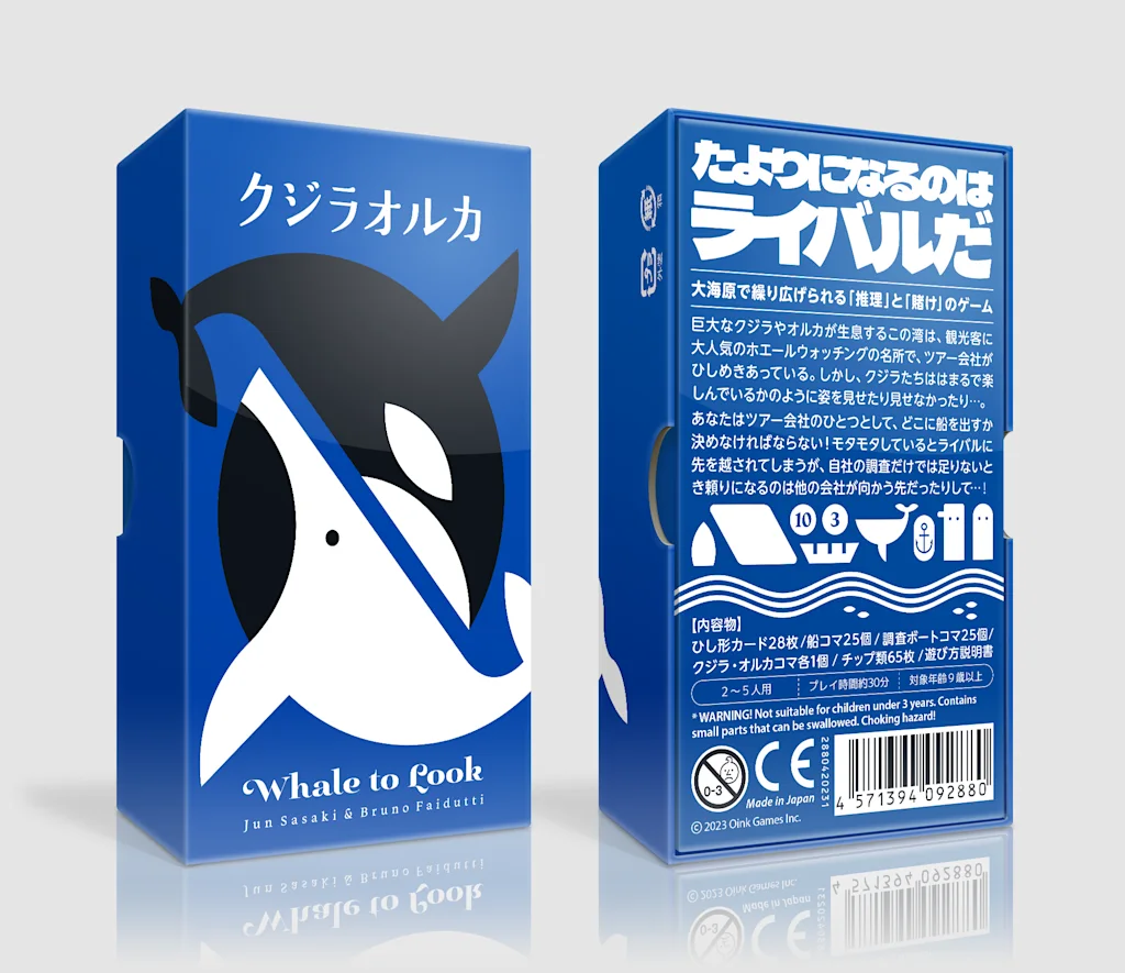 株式会社オインクゲームズは、2023年5月13日〜14日に東京ビッグサイトで開催されるゲームマーケット2023春にて、新作ボードゲーム『クジラオルカ』を発売します。一般販売は5月26日(金)です。 『クジラオルカ』は、ホエールウォッチングで繰り広げられる情報戦ゲーム。ツアー会社のひとつとなって、クジラやオルカが出没するエリアを推理し、船を出して観光客を喜ばせましょう。推理の手がかりは周囲の魚群カードですが、全ての調査をしているヒマはありません。他の会社が船を出す場所もヒントにしながら、船を出す度胸が求められます!でも、クジラは魚の多い場所に、逆にオルカは魚の少ない場所に出るので、クジラだと思ったら勘違いだった、なんてこともあって…?運・戦略・読み合いの要素が美しく絡み合う、これぞボードゲーム、と呼べる作品です。