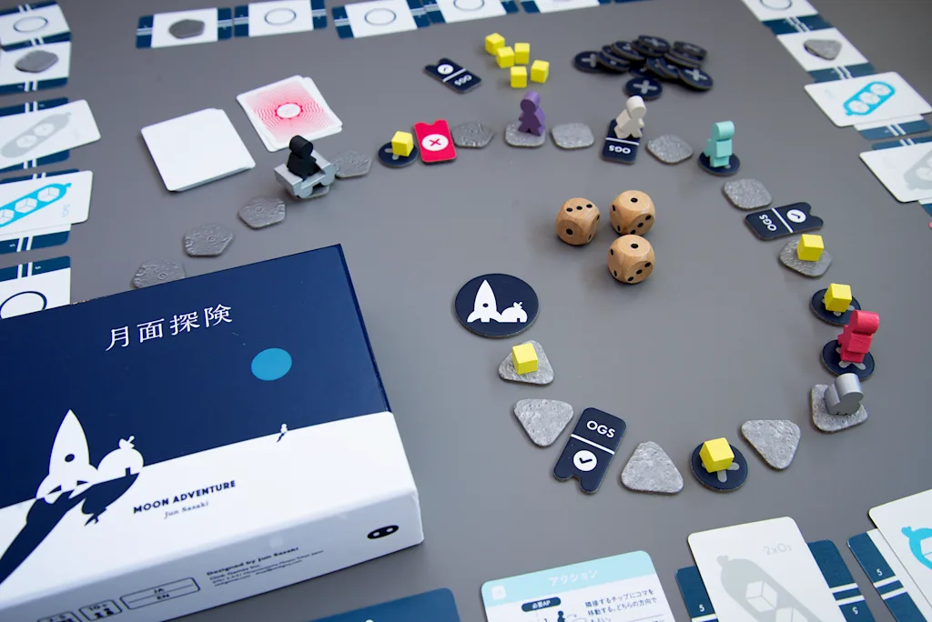 【商品概要】 ◆商品名: 月面探険 ◆価格: 2,700円+税 ◆対象年齢: 10歳以上 ◆プレイ時間: 約40分 ◆プレイ人数: 2~5人 ◆内容物: チップ類 48枚 / カード 61枚/ 木製ダイス 3個 / 木製コマ類 17個 / 遊び方説明書(JP/EN) ◆ゲームデザイン:佐々木隼 ◆アートワーク:佐々木隼 ◆プレスキット: https://www.dropbox.com/scl/fo/08tzpue8gt2ayxgd52d1i/ANIWhZ1XvzyoKu2r4Uxt7vg?rlkey=7d5ymryzfme1vacgqpxjbe4zh&dl=0
