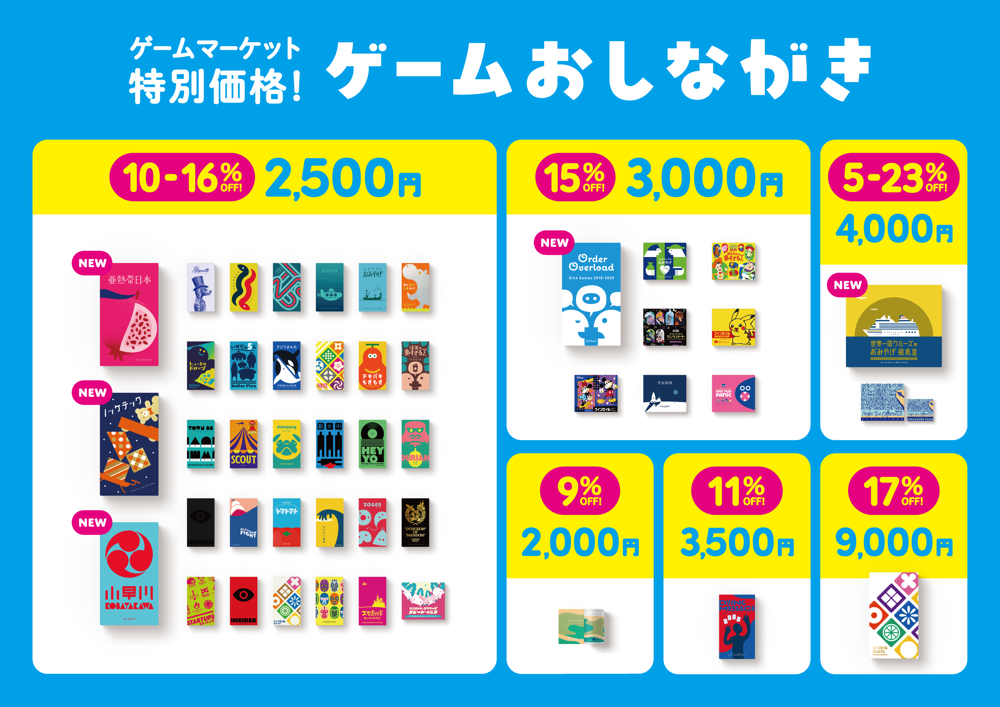 今回のゲームマーケットでは、販売可能な定番ゲームもすべて販売します。 また、今年郵船クルーズ様より発売した『世界一周クルーズのおみやげ 飛鳥Ⅲ』も限定数販売。 そのほか、新作グッズや、7月の「オインクゲームズのボードゲーム15年展」にて販売したグッズも販売予定ですので、ぜひこの機会にお求めください。