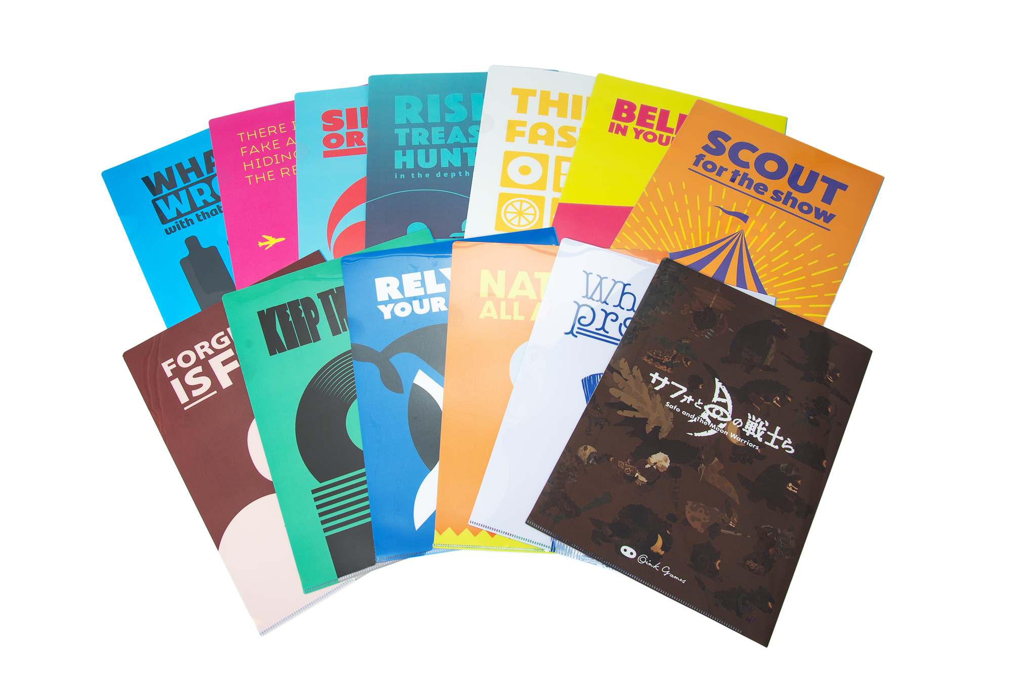 オインクゲームズのゲームから厳選した12作品の英文キャッチフレーズをデザインしたクリアファイル。ぜひ、日常的に持っておきたいフレーズを見つけてみてください。