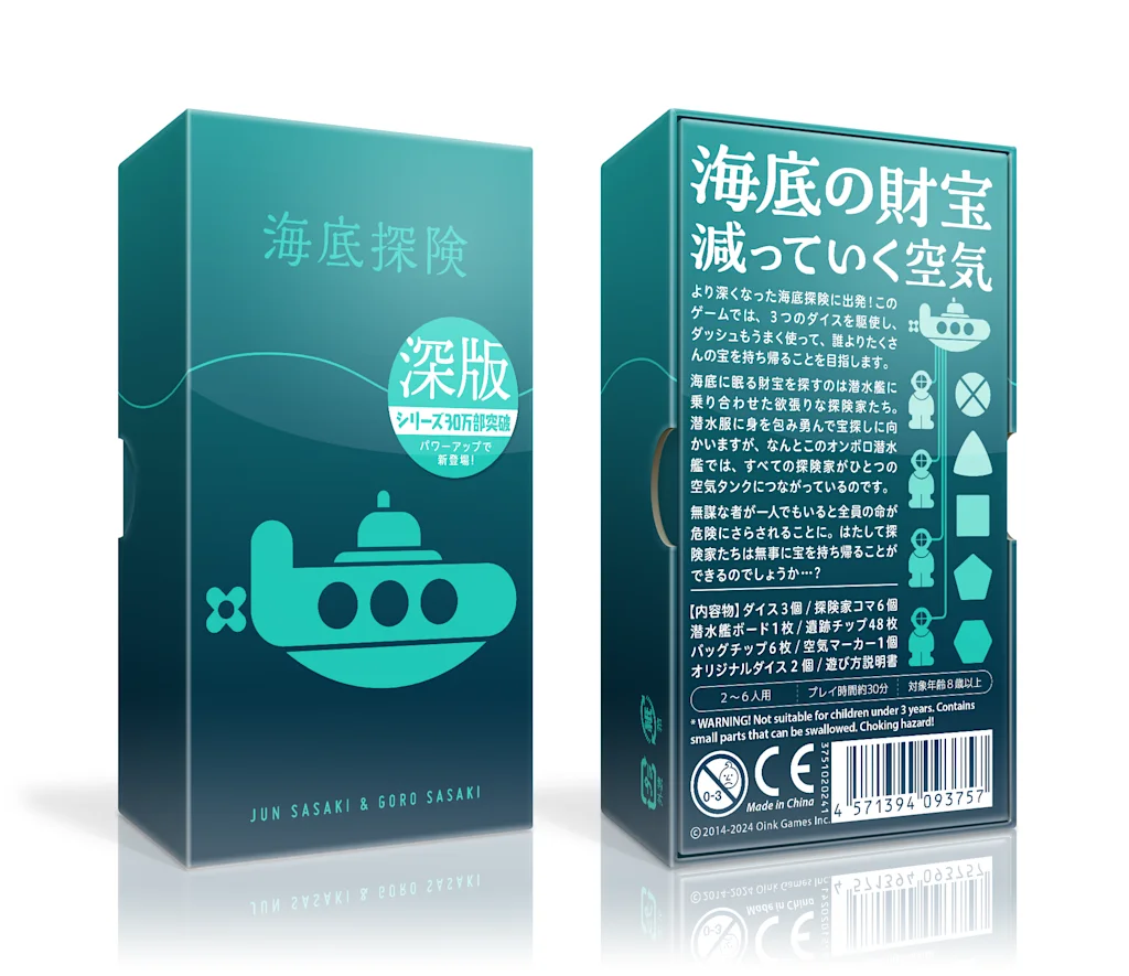 ◆商品名: 海底探険 深版 ◆価格: 2,700円+税 (ゲームマーケット会場では特別価格2500円で販売) ◆対象年齢: 8歳以上 ◆プレイ時間: 約30分 ◆プレイ人数: 2~6人 ◆内容物: 特殊ダイス3個/探険家コマ6個/遺跡チップ48枚/バッグコマ6個/潜水艦ボード1枚/空気マーカー1個/オリジナルダイス2個/遊び方説明書 ◆ゲームデザイン:佐々木隼 & 佐々木吾朗 ◆アートワーク:佐々木隼 ◆紹介ページURL: https://oinkgames.com/ja/games/analog/deep-sea-adventure-boost/ ◆プレスキット:https://www.dropbox.com/scl/fo/zdwsps789esjlfdmdpcig/ANLnljYyzMRH5VLdKl5GgGs?rlkey=z4c6aa583ap2hvq83lsmss0vf&dl=0