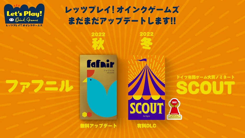 ボードゲームやデジタルゲームの開発を手がける株式会社オインクゲームズは、同社が開発するNintendo SwitchとSteam用ソフト「レッツプレイ!オインクゲームズ」内で遊べるボードゲームに、今年中に2作品を追加することを発表しました。2022年秋には「ファフニル」を無料で追加予定。さらに2022年冬には、ドイツ年間ゲーム大賞ノミネート作である「SCOUT」が有料追加コンテンツとして追加される予定です。追加コンテンツの価格は検討中です。