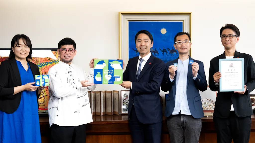 (左から、株式会社オインクゲームズ 稲垣 敬子、株式会社オインクゲームズ 代表取締役 佐々木 隼、鎌倉市 松尾 崇市長、鎌倉エシカルラボ 稲葉 哲治氏、鎌倉市 市民防災部 商工課 角田 如生氏)